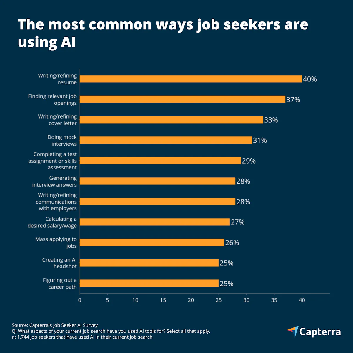 Capterra posted some interesting research on how candidates are using AI in their application process. I'll admit to being surprised that resume-editing wasn't higher and that there were so many use cases where more than 25% of candidates.